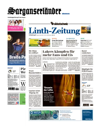 PK 27 Linth Sarganserland Presse Kombi 27 Linth-Sarganserland Das Presse Kombi 27 Linth-Sarganserland umfasst die Titel Linth-Zeitung und Sarganserländer und deckt das Gebiet von Sargans bis an den Zürichsee ab. Mediendaten PK 27 Linth Sarganserland DIE KOMBINATION BESTEHT AUS FOLGENDEN TITELN BUCHBARE WERBEFORMATE Flexible Alleskönnerin Inserate Platzieren Sie Ihre Botschaft. Ob hoch oder quer, klein oder gross; für jede Gelegenheit und für jedes Budget das passende Inserat.