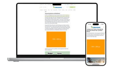 Hinterlassen Sie Eindruck. Das Halfpage Ad ist ein auffälliges, grosszügiges Format, welches den Blick der Userinnen und User garantiert auf Ihre Werbebotschaft lenkt. Es gilt ausserdem als eines der beliebtesten Formate – nicht zuletzt, weil es auch beim Scrollen durch die Seite immer präsent bleibt.